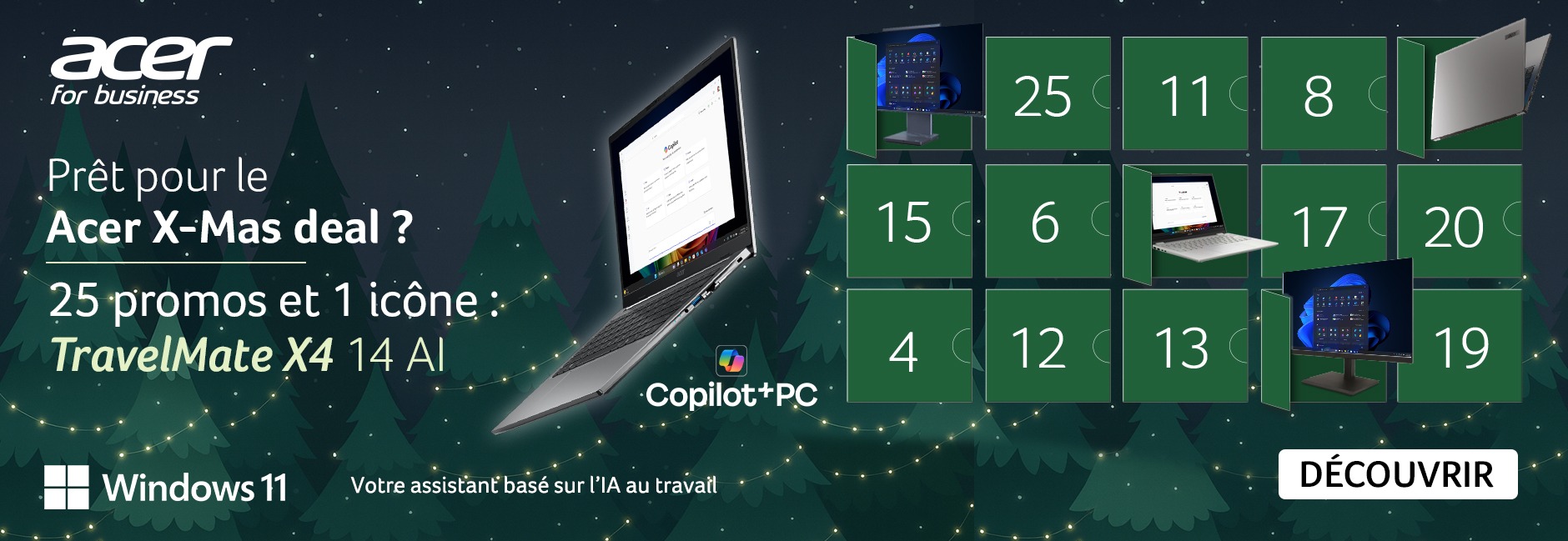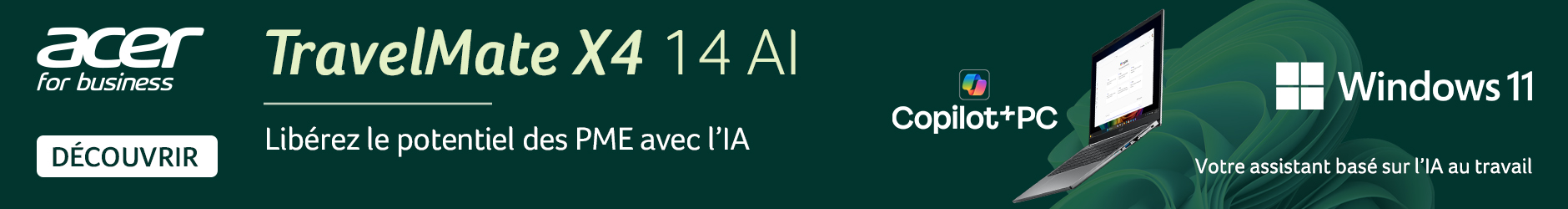 Notre sélection de PC portable Pro chevron chevron Portable Dell 16 DC16250 - Intel Core 5 - 120U jusqu'à 5 GHz - Win 11 Pro - Intel Graphics - 8 Go RAM - 512 Go SSD NVMe 16p 1920 x 1200 Full HD Plus Wi-Fi 6 P/N : TPJFH | EAN : 5397184953006 | SKU : DELTPJFH En stock Voir le produit Portable HP Elite DragonFly G4 Intel Core i5-1355U 32GO 1TOSSD Intel Iris X Graphics 13,5 WUXGA+ WIN11PRO 5G 3/3/0 B69F1ET P/N : B69F1ET | EAN : 198990764580 | SKU : HPCEDFB69F1ET En stock Voir le produit Portable HP ProBook 4 AMD Ryzen 3 210 8Go 512GoSSD AMD Radeon Graphics 16'' WUXGA Win11Pro B9YS1ET P/N : B9YS1ET | EAN : 0199251777509 | SKU : HPCPB4B9YS1ET En stock Voir le produit Station de Travail HP Zbook 8 Intel Core U7-255H 32GB 1TB Intel Arc 140T 14" WUXGA 300 nits Win11Pro C79MYET P/N : C79MYET | EAN : 0199642183513 | SKU : HPCZBOOK8C79MYET En stock Voir le produit Station de Travail HP ZBook Fury 16 G1i Intel Core U7-255HX 32GB 1TB NVIDIA RTX Pro 2000 Blackwell 8GB 16" WUXGA 400nits Win11Pro C79YPET P/N : C79YPET | EAN : 0199642184169 | SKU : HPCZBF16C79YPET En stock Voir le produit Station de Travail HP ZBook Power G11 A AMD Ryzen 7 8845HS 32GB 1TB NVIDIA RTX 1000 Ada 6GB 16'' WUXGA 300nits Win11Pro C78P5AT P/N : C78P5AT | EAN : 0199642174313 | SKU : HPCZBPOWERC78P5AT En stock Voir le produit Portable HP EliteBook 8 Intel Core Ultra U7-255U 16GB 512GoSSD Intel Graphics 12 Tops 14'' WUXGA Win11Pro AD4A4ET P/N : AD4A4ET | EAN : 0199251777752 | SKU : HPCEB8AD4A4ET En stock Voir le produit Portable HP EliteBook 6 Intel Core Ultra U7-255U 16Go 512GoSSD Intel Graphics 12 Tops 13.3'' WUXGA Win11Pro AD4F1ET P/N : AD4F1ET | EAN : 0199251830556 | SKU : HPCEB6AD4F1ET En stock Voir le produit Portable ACER TravelMate X4 14 AI TMX414-51-TCO-798G Intel Core Ultra 7 256V 16Go 1ToSSD Intel Arc Graphics 140V 14" WUXGA Win11Pro NX.BPVEF.002 P/N : NX.BPVEF.002 | EAN : 4711474711229 | SKU : ACTMX414798G En stock Voir le produit Portable Acer TravelMate X4 14 AI TMX414-51-TCO-52KQ Intel Core Ultra 5 226V 16Go 512GoSSD Intel Arc Graphics 130V 14" WUXGA Win11Pro NX.BPVEF.001 P/N : NX.BPVEF.001 | EAN : 4711474711199 | SKU : ACTMX41452KQ En stock Voir le produit Portable HP EliteBook X G1i Intel Core Ultra U5 - 228V 32Go 512GoSSD Intel ARC Graphics 40 Tops 14''WUXGA 800nits Tactile Copilot + PC Win11Pro BA0A3ET P/N : BA0A3ET | EAN : 0199251784385 | SKU : HPCEBXFLIPBA0A3ET En stock Voir le produit Portable HP EliteBook X G1i Intel Core Ultra U5 - 228V 32Go 512GoSSD Intel ARC Graphics 40 Tops 14''WUXGA 400nits Tactile Copilot + PC Win11Pro BA0A2ET P/N : BA0A2ET | EAN : 0199251784392 | SKU : HPCEBXFLIPBA0A2ET En stock Voir le produit