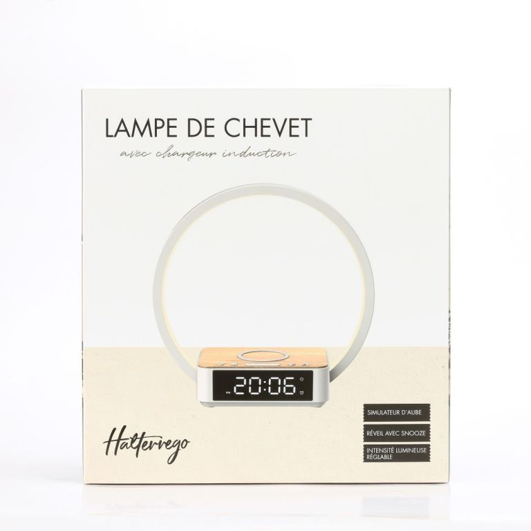 Lampe de chevet avec chargeur induction certifié Qi à 10W, fonction réveil, lumiosité réglable, affichage l'heure