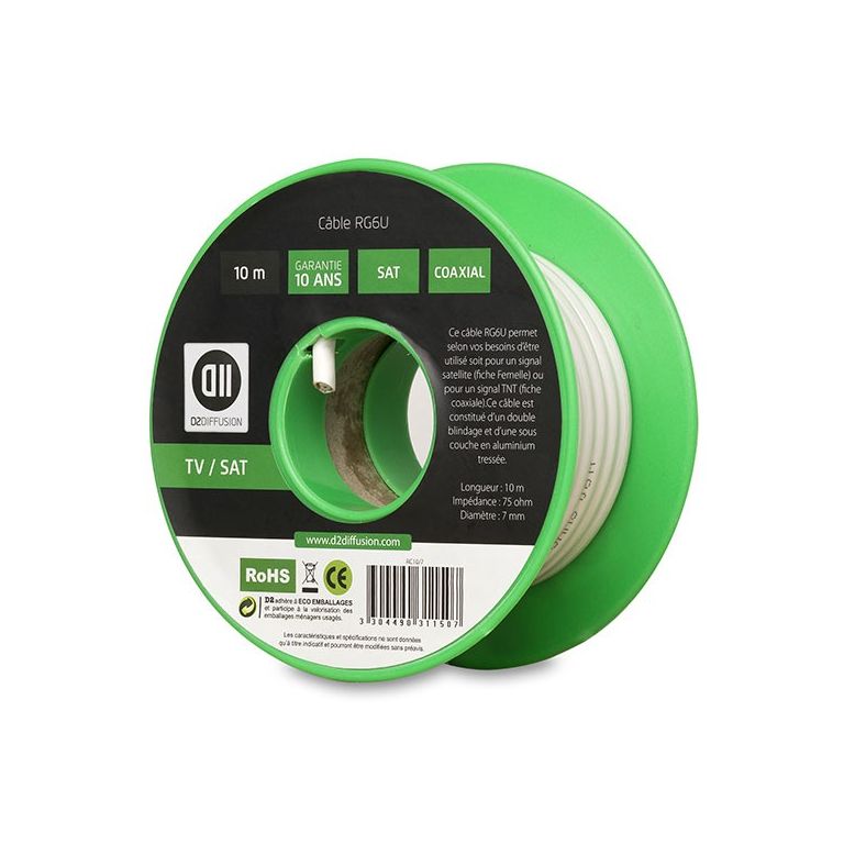 D2 Diffusion D2BOB10. Longueur de câble: 10 m, Type de câble: RG-6/U, Genre de connecteur 1: Mâle. Quantité: 1 pièce(s)