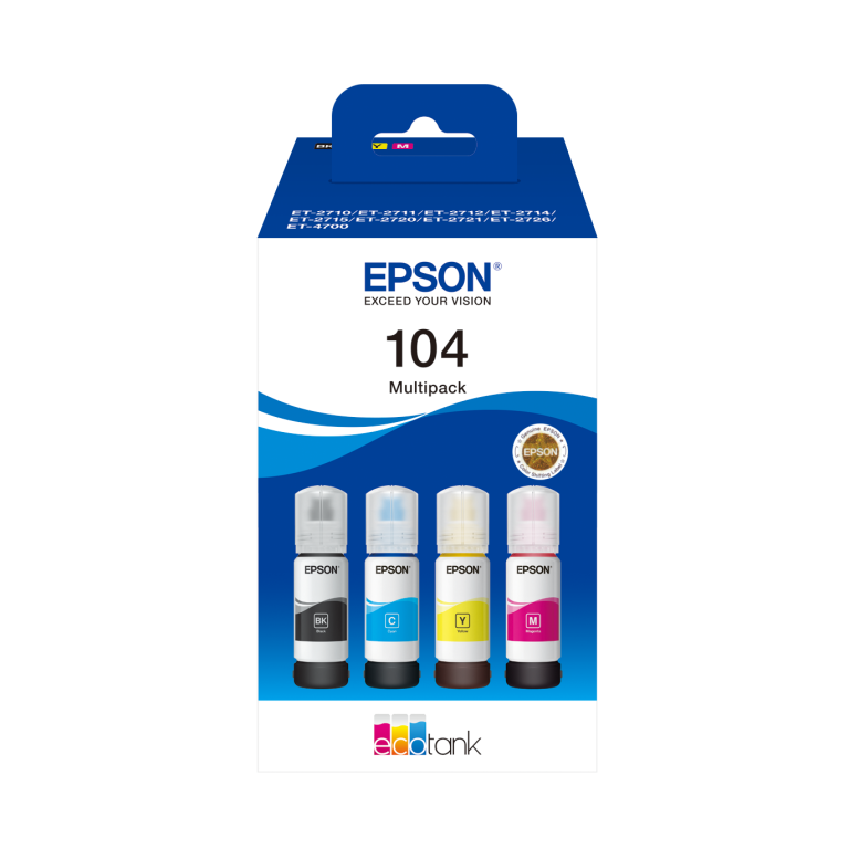 Epson 104 EcoTank 4-colour Multipack. Type: Original, Couleurs d'impression: Noir, Cyan, Magenta, Jaune, Compatibilité de marque: Epson. Quantité: 1 pièce(s), Largeur du colis: 95 mm, Profondeur du colis: 98 mm. Longueur du casier principal (externe): 480 mm, Largeur du casier principal (externe): 310 mm, Hauteur du casier principal (externe): 150 mm