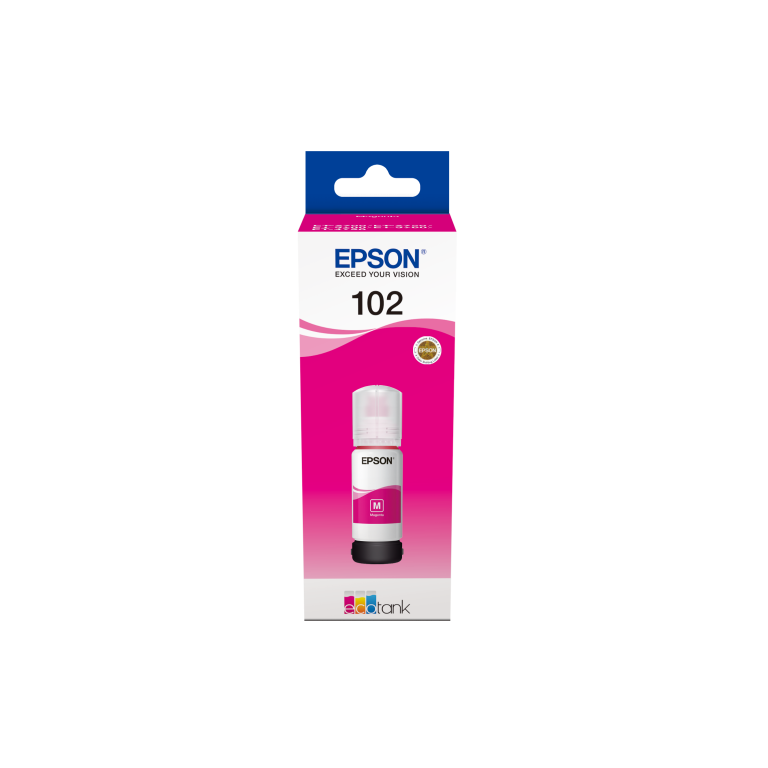 Epson 102 EcoTank Magenta ink bottle. Type: Original, Couleurs d'impression: Magenta, Compatibilité de marque: Epson. Quantité: 1 pièce(s), Largeur du colis: 58 mm, Profondeur du colis: 175 mm. Poids brut du casier principal (externe): 4,72 kg, Longueur du casier principal (externe): 480 mm, Largeur du casier principal (externe): 310 mm