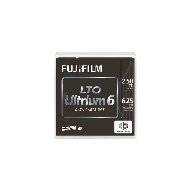Fujifilm LTO Ultrium 6 tape. Type de produit: Bande de données vierge, Type de support: LTO, Capacité d'origine: 2,5 To. Taux de transfert: 160 Mo/s, Taux de tranfert en mode compressé: 400 Mo/s. Taille de la bande magnétique: 1,26 cm, Longueur de la bande: 846 m, Épaisseur de la bande: 6,1 µm. Dimensions (LxPxH): 102 x 105,4 x 21,5 mm