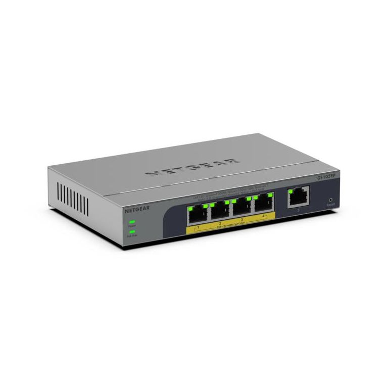 NETGEAR GS105EP. Type de commutateur: Non-géré. Type de port Ethernet RJ-45 de commutation de base: Gigabit Ethernet (10/100/1000), Quantité de ports Ethernet RJ-45 de commutation de base: 5. Full duplex. Répertoire MAC: 2000 entrées. Standards réseau: IEEE 802.1p, IEEE 802.3az. Connexion Ethernet, supportant l'alimentation via ce port (PoE)